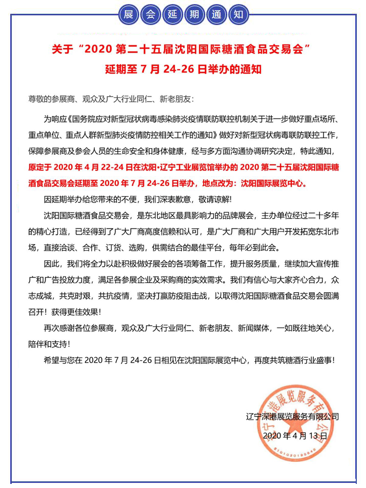| 【重要通知】關(guān)于“2020第二十五屆沈陽國際糖酒食品交易會”延期至7月24-26日舉辦的通知 | |