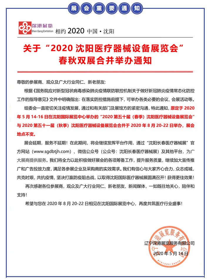 | 【雙展合并】2020第五十一屆沈陽(yáng)國(guó)際醫(yī)療器械設(shè)備展覽會(huì)8月20-22日在沈陽(yáng)國(guó)際展覽中心舉辦!??! | |