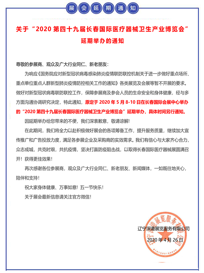 【重要通知】關(guān)于“2020第四十九屆長春國際醫(yī)療器械衛(wèi)生產(chǎn)業(yè)博覽會”延期舉辦的通知